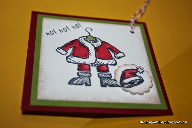 Well, then, while I had that CUTE “Get Your Santa On” stamp set out, I just HAD to make this tag. The hat was punched this time with the 7/8″ scallop circle punch and added to the tag with a Stampin’ dimensional. The layers are 3″ Cherry Cobbler square, 2-3/4″ Old Olive Square and 2-1/2″ Whisper White square sponged with Crumb Cake ink. Of course I used Memento black ink because I used Cherry Cobbler and Old Olive Blendabilities to color the image.