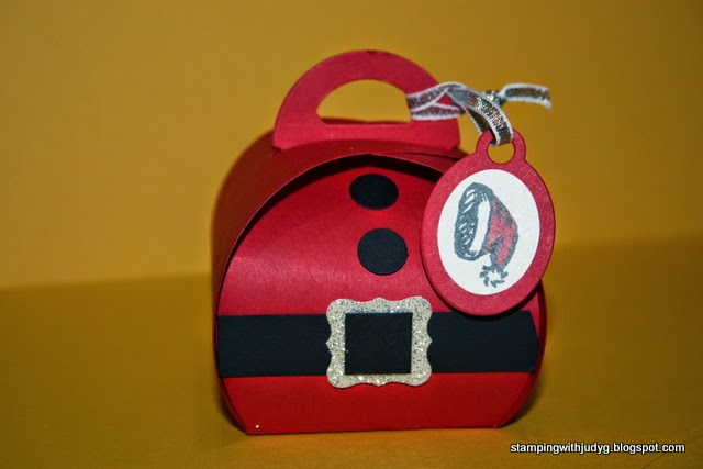 Thanks for stopping by! You may have seen various versions of this Curvy Keepsake box on-line. Did you know that one of the little tags that comes with this set of framelits fits the Small Oval punch!?! That made putting the cute little Santa hat tag on the treat box a breeze!