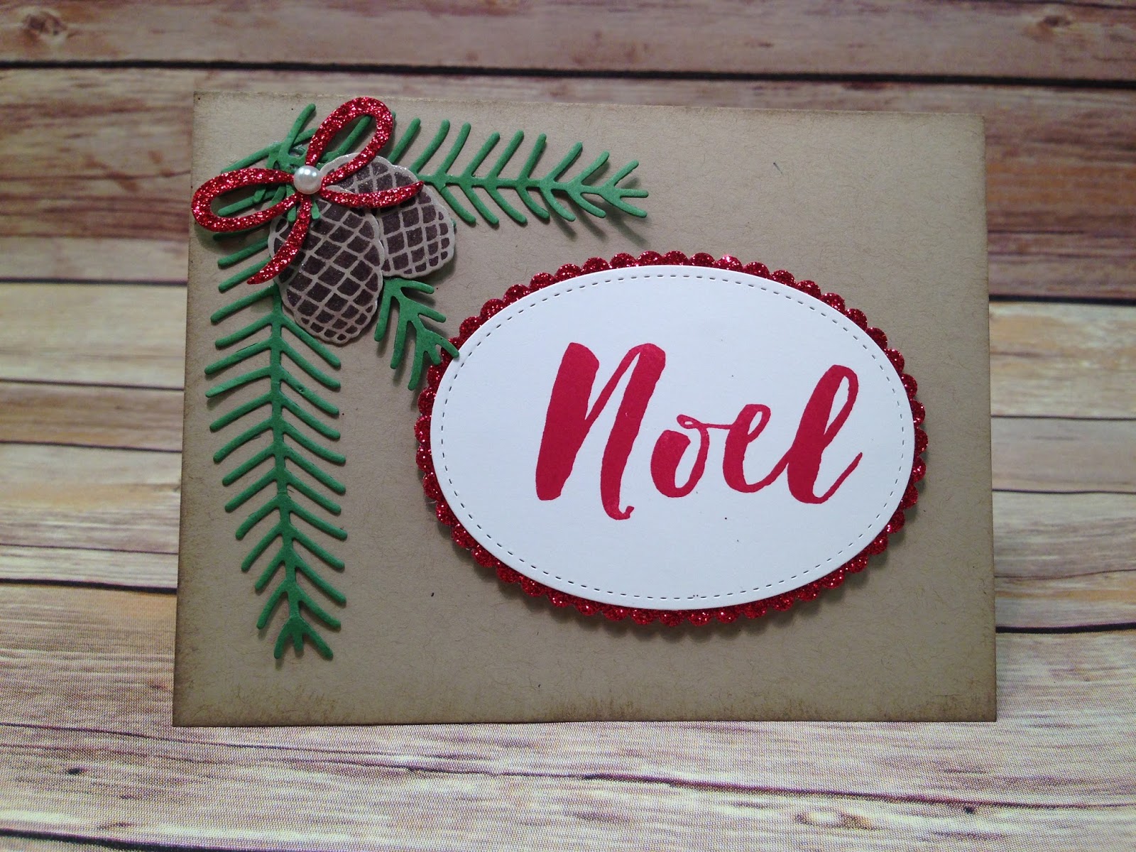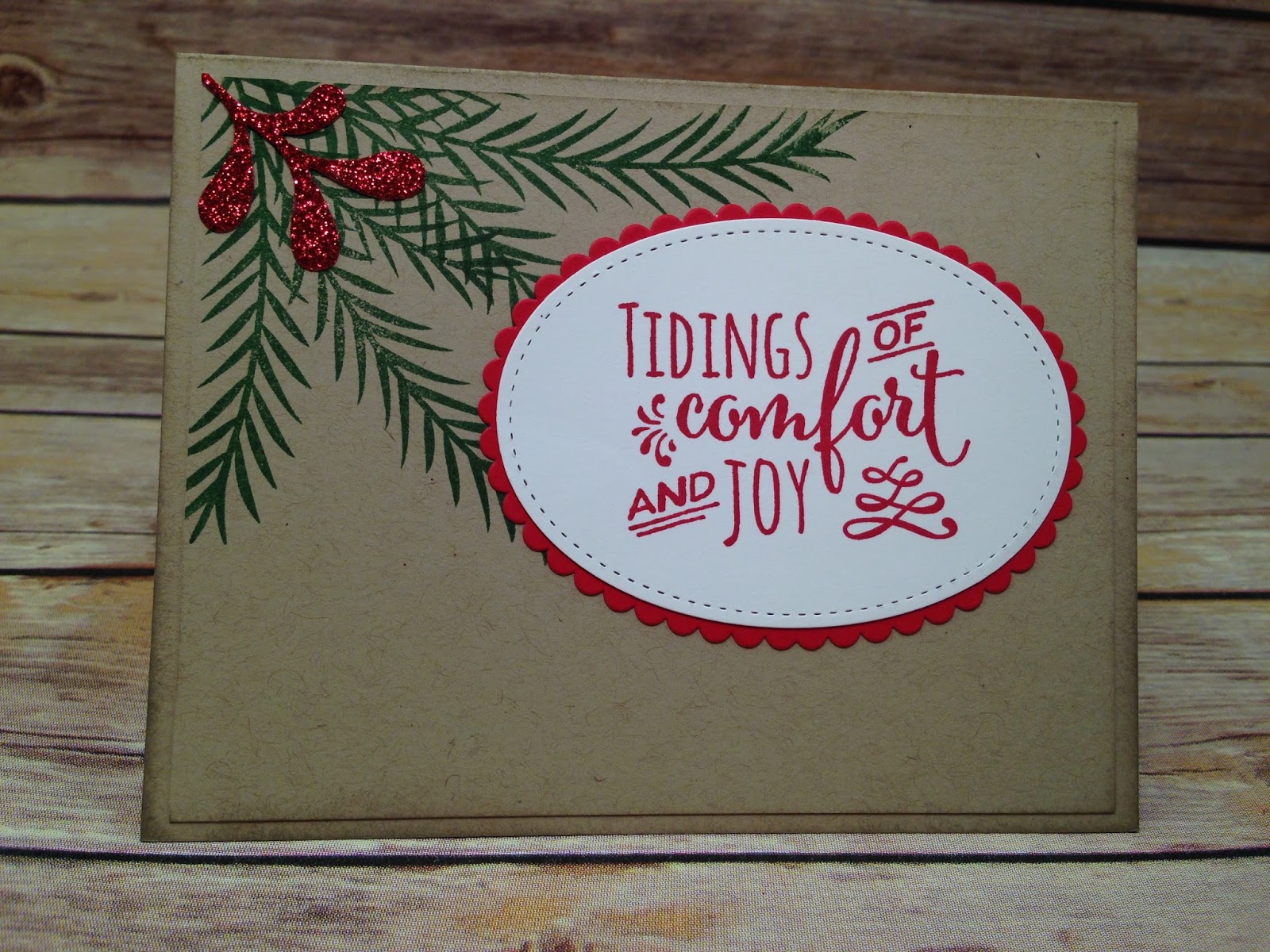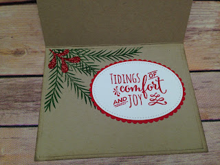 Although I used red glimmer paper on the front of the card for the scallop oval, I used Real Red cardstock on the inside. The pine branches are stamped onto the card and everything on the inside of the card is glued, not dimensionaled. I sponged around both the front and inside of the card with Crumb Cake ink.
