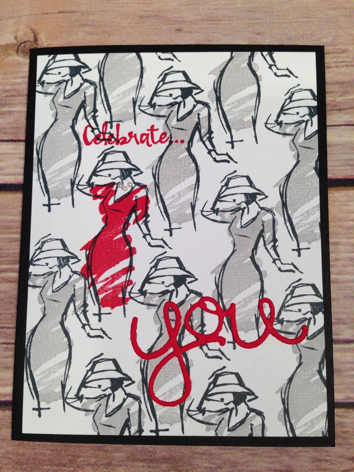 This is a regular size A2 card (finished size 5.5″ x 4.25″) I stamped all the ladies first with Tuxedo Black memento ink then stamped all but one dress with Smokey Slate ink. Finally I stamped the sentiment and the last dress in Real Red classic ink. The ‘Hello You’ thinlits were used to cut the “you” out of Real Red card stock.Very subtle and hard to see on the photo are the three tiniest pearls I added for a necklace on the lady in red.