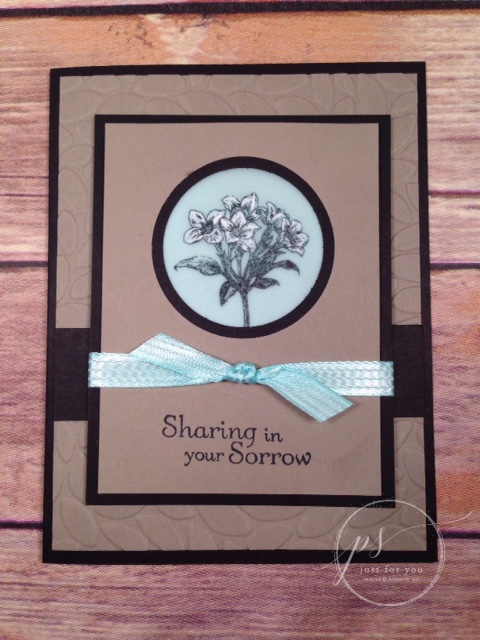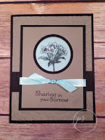 3.    Hold the 4” x 3” Tip Top Taupe piece over the 3 ¾” x 2 ¾” Basic Black piece and, centered near the top, punch a 1 ¾” circle through both layers,. Then, center the 2” circle punch over the circle in the Tip Top Taupe piece only and punch the larger circle. (this creates the black inside border) Stamp the sentiment from Thoughts and Prayers toward the bottom of the Tip Top Taupe piece with Tuxedo Black Ink. Adhere these two pieces together with multipurpose glue carefully lining up the circle border.