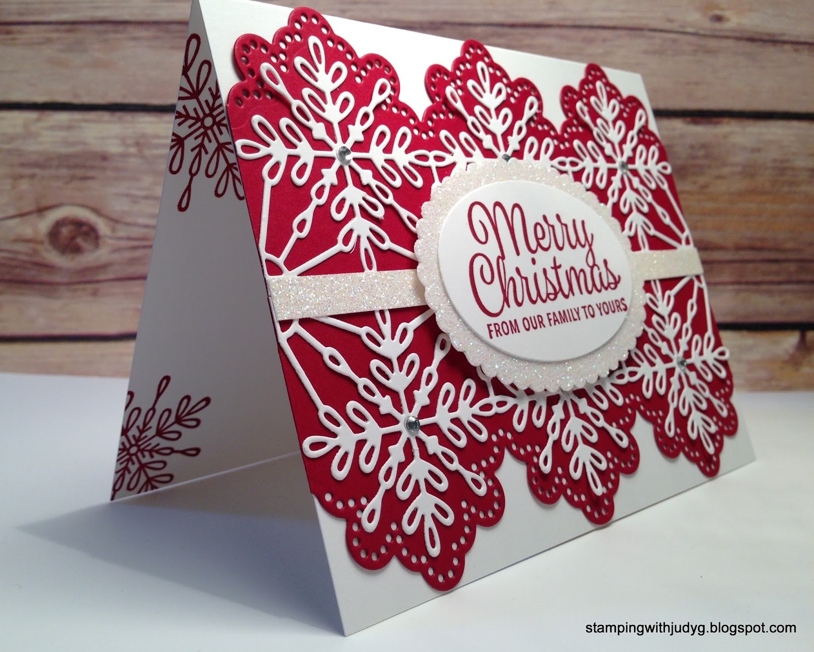 The card front is made from two die cut pieces of Real Red and Whisper White card stock. Once I glued the white pieces to the red pieces, I cut the pieces down to precisely 5.5″ x 2-1/8″ and adhered them to the card front so they met in the center. I covered the seam with a 1/4″ strip of Dazzling Diamonds glimmer paper.