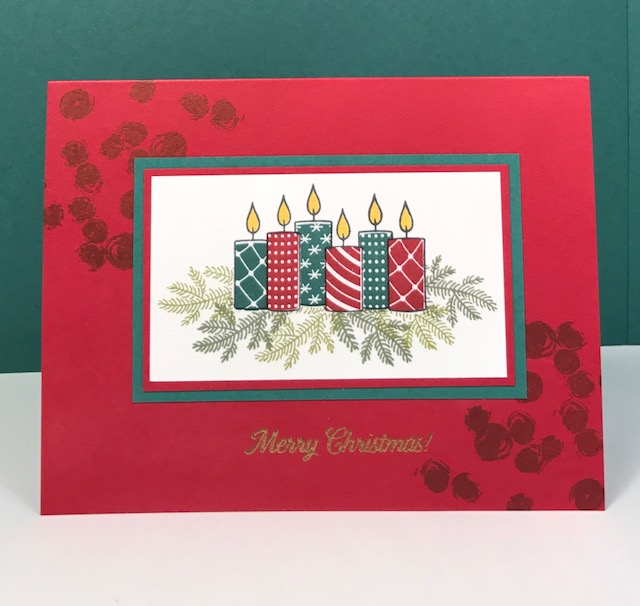 - Stamp the pine boughs over the masked candles in Old Olive and Tranquil Tide. Remove mask.