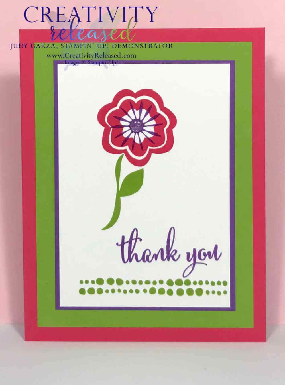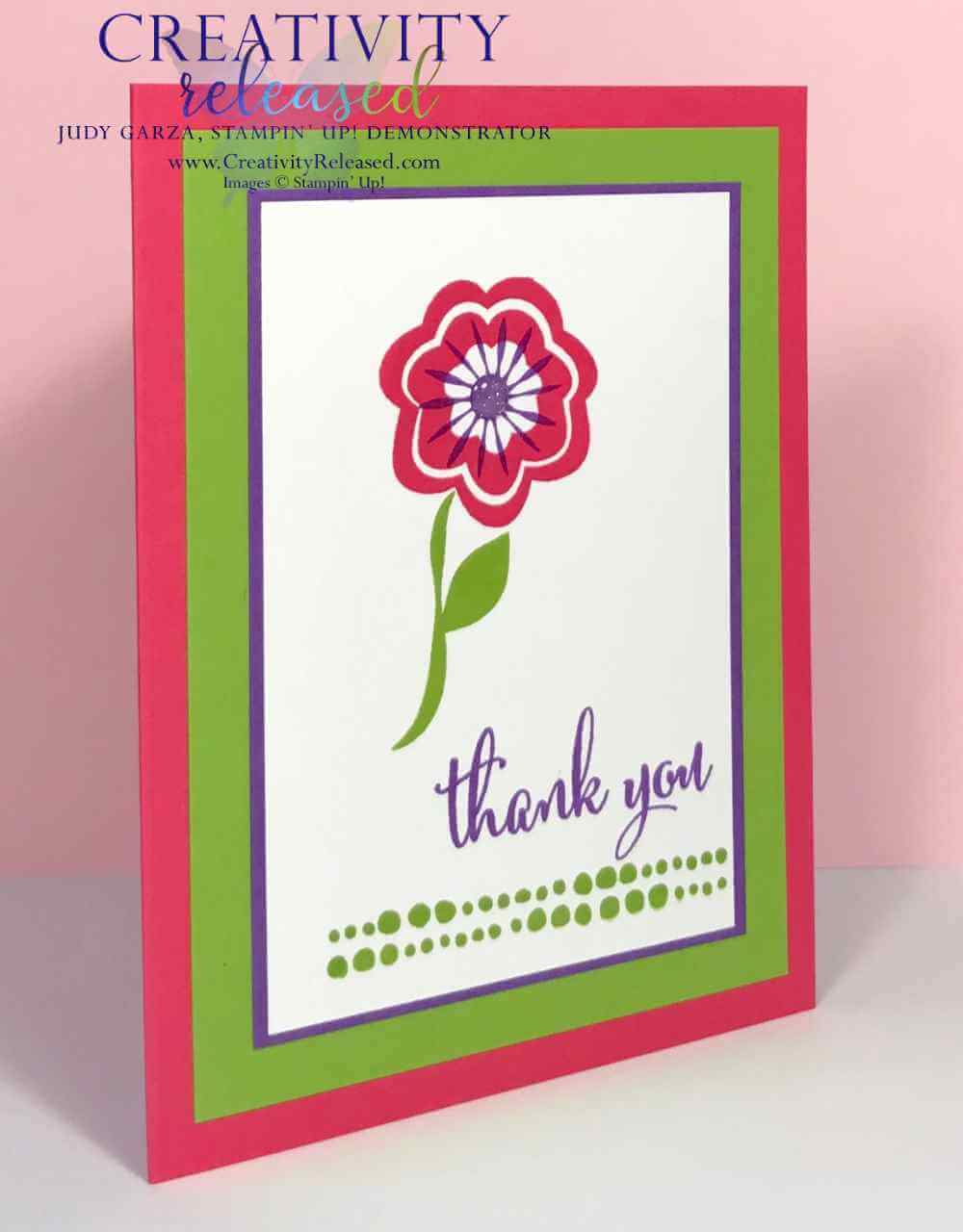 This seventeen (17) piece photopolymer stamp set makes a bold statement on paper!  It is super easy to use because of it being photopolymer.  As you may know, it enables us to see exactly where it will stamp.  I designed this for my thank you cards to be included in all my orders this month.  I needed it to be fast and simple yet bold and bright to make a splash!  Using bright colors, I was able to achieve that goal.  I had to use a sentiment from another stamp set because, as you can see, the stamp set does not have any sentiments.  I chose the Thank You sentiment from Love What You Do stamp set in the 2018-19 Annual Catalog.  Really ANY sentiment could work on this card hence, I love the versatility of the Bloom By Bloom stamp set.