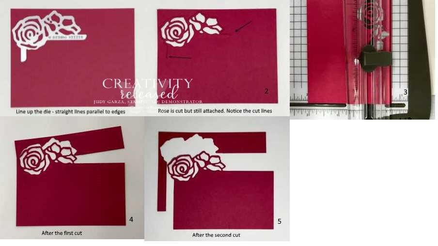 Let me explain how I used this die to make the red focal part on my card. I started with a 2 3/4″ x 3 1/2″ piece of Lovely Lipstick card stock. I positioned the die into the upper left corner lining up the edges of the flower with the top and side edge of the paper. Equally important, I made sure the longer straight line was straight horizontally and the shorter straight perpendicularly (1) Of course, this cut the flower into the corner but it did not remove the edges. (2) I lined up the card stock on my Stampin’ Trimmer with the cut line directly over the cutting groove and cut.(3-4) Likewise, I positioned the other side in the same manner and cut. (5)