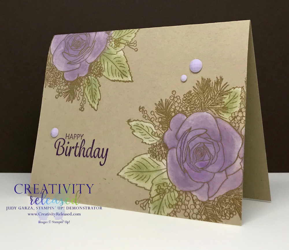 I used Highland Heather and Pear Pizzazz ink on my image that was gold embossed onto a Crumb Cake card base. I stamped the sentiment with Gorgeous Grape.